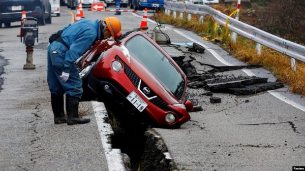 A worker looks at a car stuck on a cracked road in the aftermath of an earthquake, near Anamizu, Japan, Jan. 3, 2024.